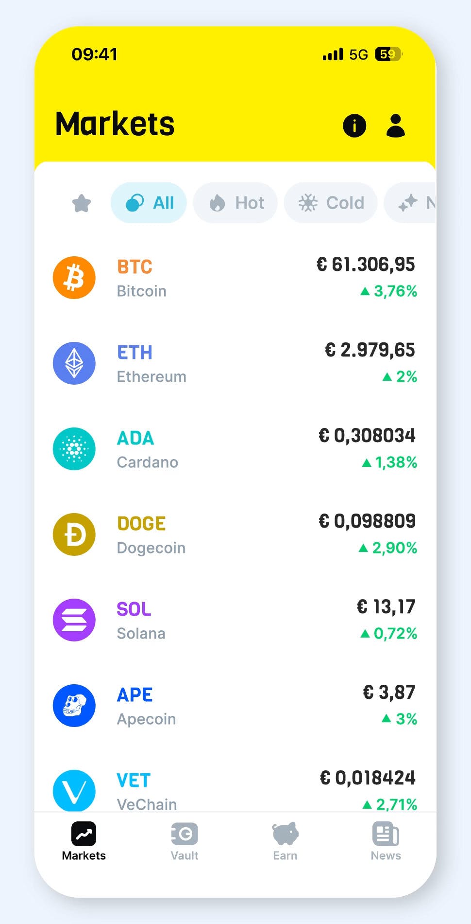 Click the 'Buy' button and determine your investment amount. You can buy Solana starting from €1. Choose 'Continue' and confirm your purchase. Your coins will be immediately visible in your BLOX vault.