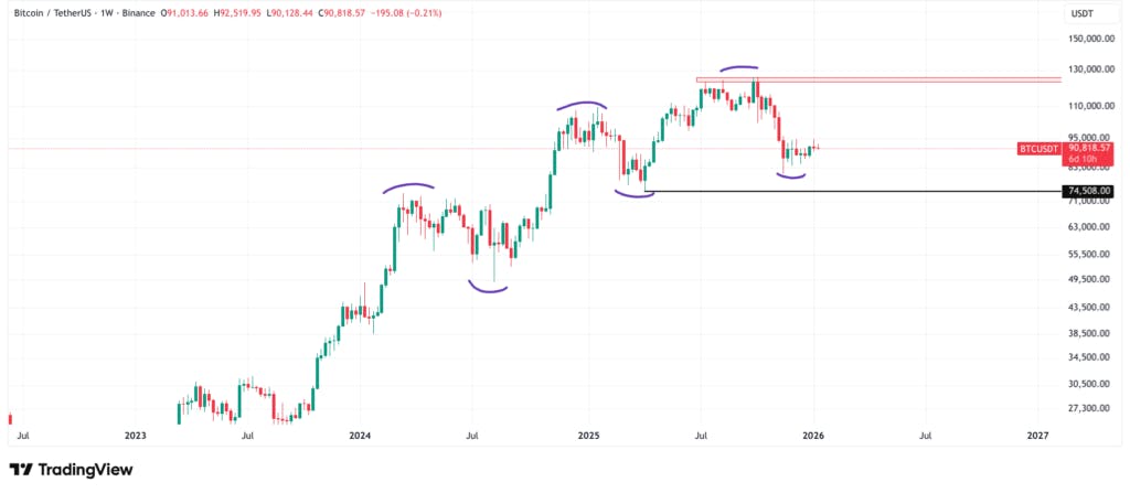 La tendencia general de Bitcoin sigue siendo alcista. A pesar de las fuertes caídas de los últimos meses, BTC continúa marcando máximos y mínimos más altos (representados con arcos morados). Mientras este patrón se mantenga, no hay señales alarmantes a largo plazo.