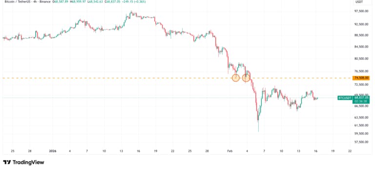 Bitcoin ha caído por debajo de su mínimo anterior (indicado por la línea naranja en torno a los 74.500 dólares). Esto implica la ruptura oficial de la tendencia alcista previa, algo que suele interpretarse como una señal desfavorable. El precio no había estado tan bajo en mucho tiempo, lo que aumenta el riesgo de nuevas caídas. Para evitar una mayor debilidad, Bitcoin deberá recuperar impulso rápidamente.