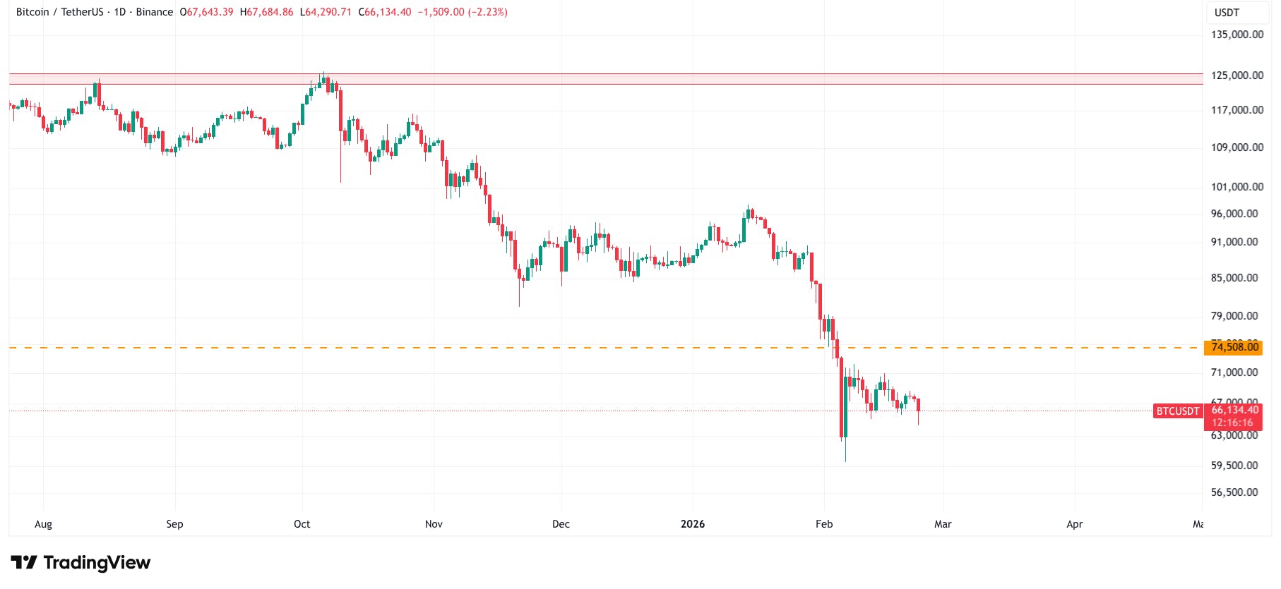 La ruptura se produjo alrededor de los 74.500 dólares. Desde allí, el precio descendió aproximadamente un 20% adicional hasta los 60.000 dólares. En ese nivel aparecieron compradores, provocando un rebote. Esto genera algo de optimismo, pero históricamente la pérdida de una tendencia alcista suele anticipar debilidad adicional.