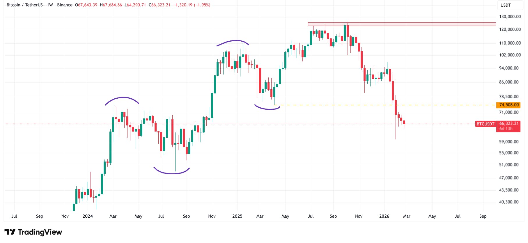 Para analizar la perspectiva a largo plazo de Bitcoin, primero observamos el gráfico semanal. Cada vela representa siete días de actividad, lo que permite evaluar el comportamiento histórico con mayor claridad.