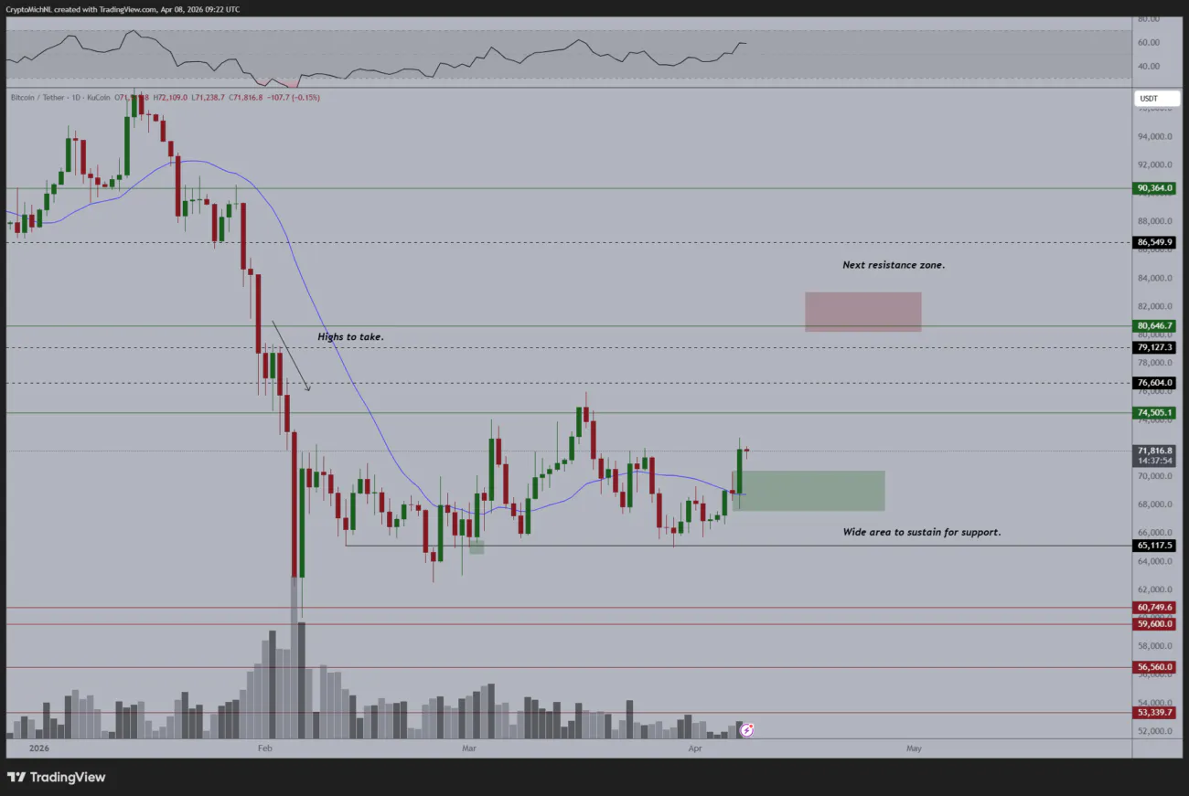 Según Michael van de Poppe, es clave que Bitcoin se mantenga por encima de los 70.000 dólares. Mientras esto ocurra, la estructura seguirá siendo positiva y el precio podrá continuar al alza. Las próximas zonas importantes están en torno a los 76.000 y 80.000 dólares, con los 90.000 dólares como posible objetivo.