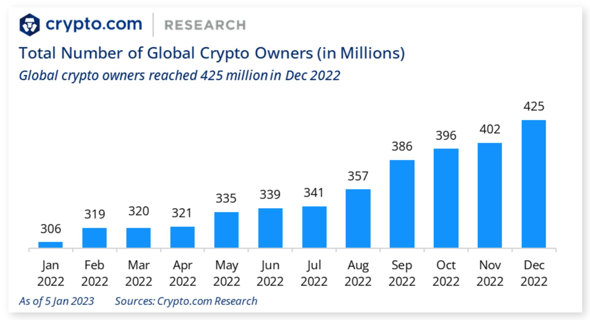 Het aantal mensen met crypto bezittingen steeg in een jaar tijd naar 425 miljoen. Bron: Crypto.com