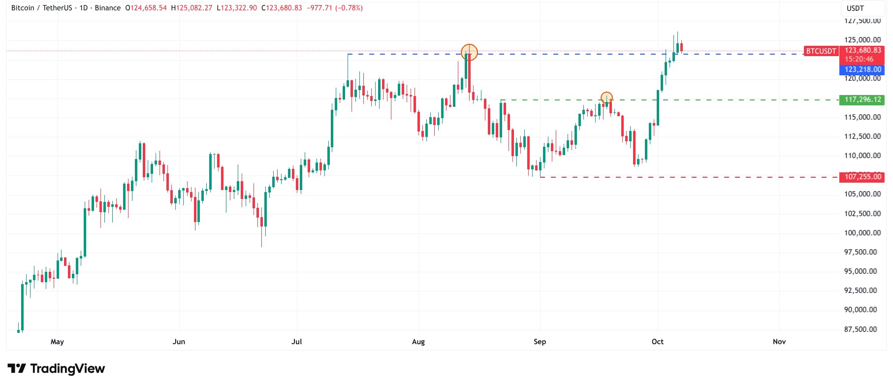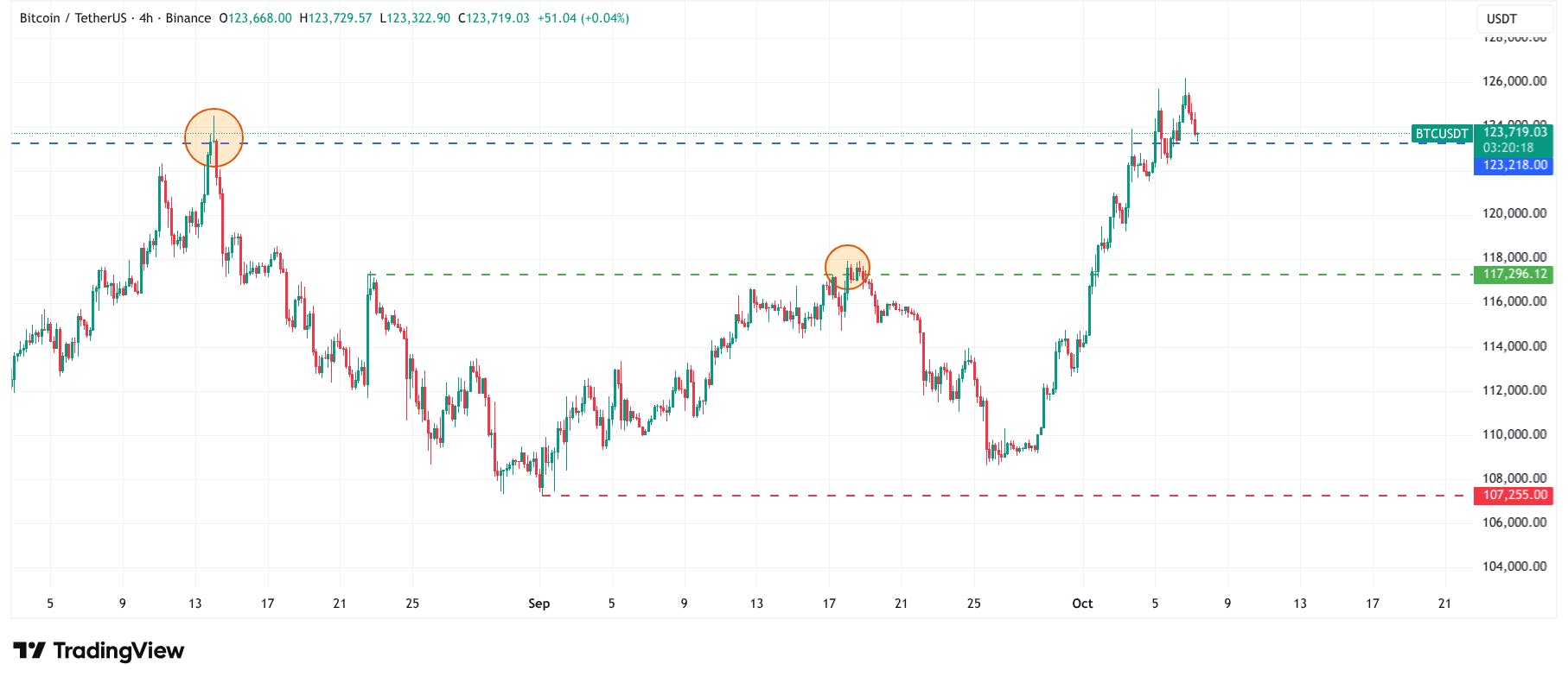 Na de doorbraak van de groene lijn namen kopers de controle over en stuwden de koers voorbij het vorige hoogtepunt rond 123.000 dollar. Hiermee is de opwaartse trend bevestigd.