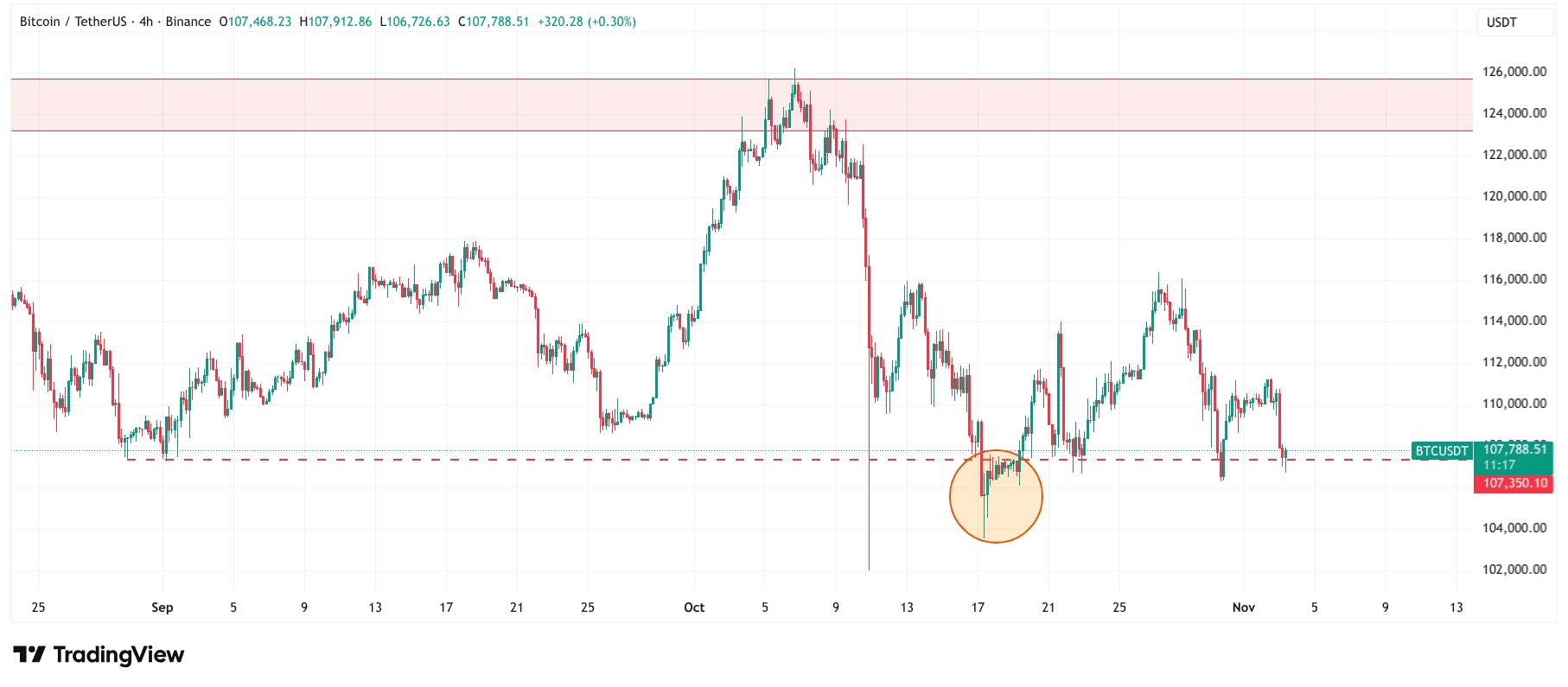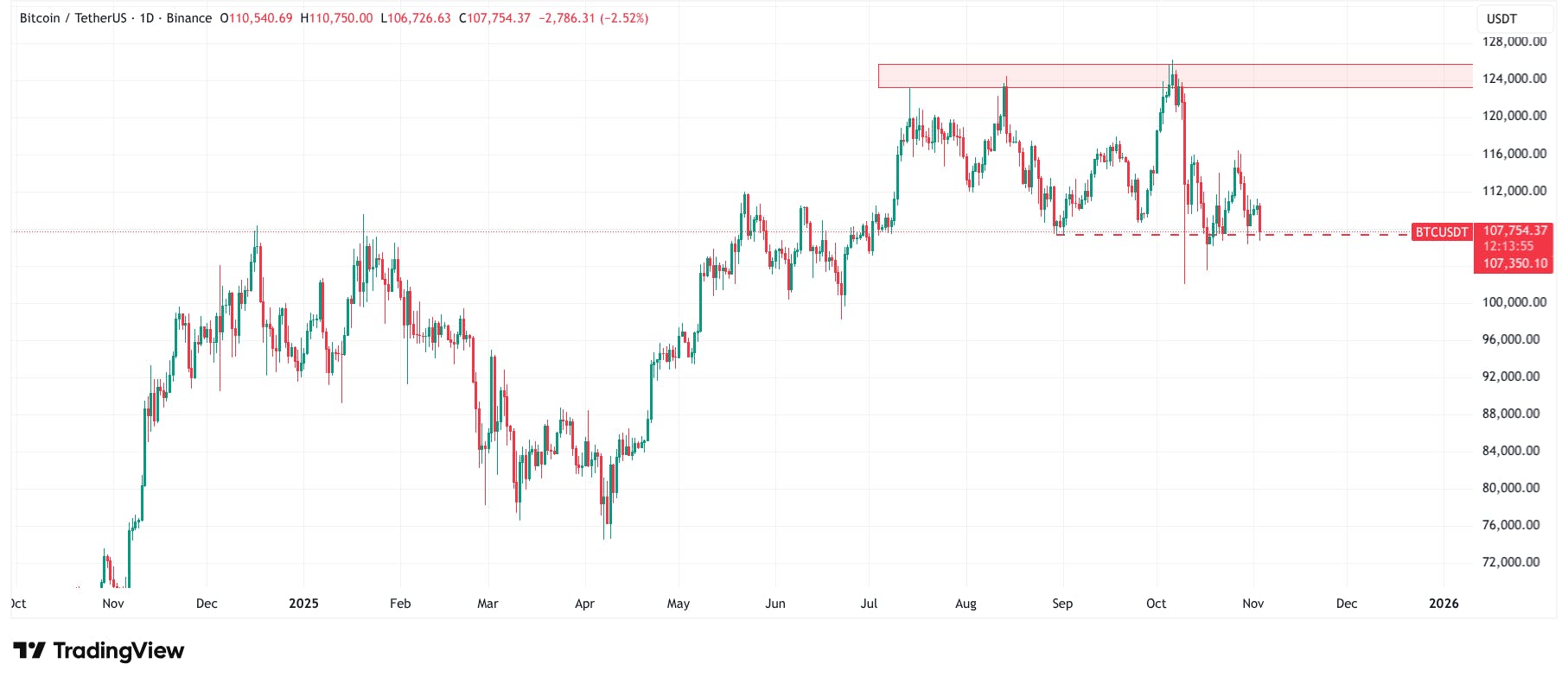 Voordat het zover is, moet Bitcoin eerst zien te blijven boven een ander belangrijk niveau: de rode lijn rond 107.000 dollar. Omdat dit op korte termijn belangrijker lijkt, richten we ons daar nu op.