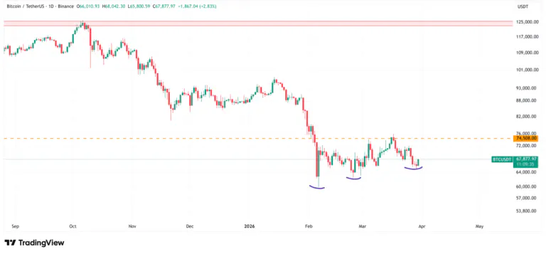 De stijgende bodems laten zien dat kopers steeds hoger instappen. Als het verkoopvolume rond de $74.500 opdroogt, kan dat leiden tot een doorbraak en een positiever vooruitzicht. Het terugwinnen van zo’n belangrijk niveau zorgt vaak voor een omslag in sentiment.