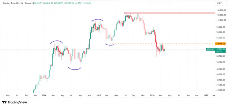 Lange tijd zat Bitcoin in een duidelijke opwaartse trend, met telkens hogere toppen en hogere bodems. Die structuur is recent doorbroken toen de koers onder $74.500 zakte. Dit niveau fungeerde eerder als een belangrijk hoger dieptepunt op de lange termijn.