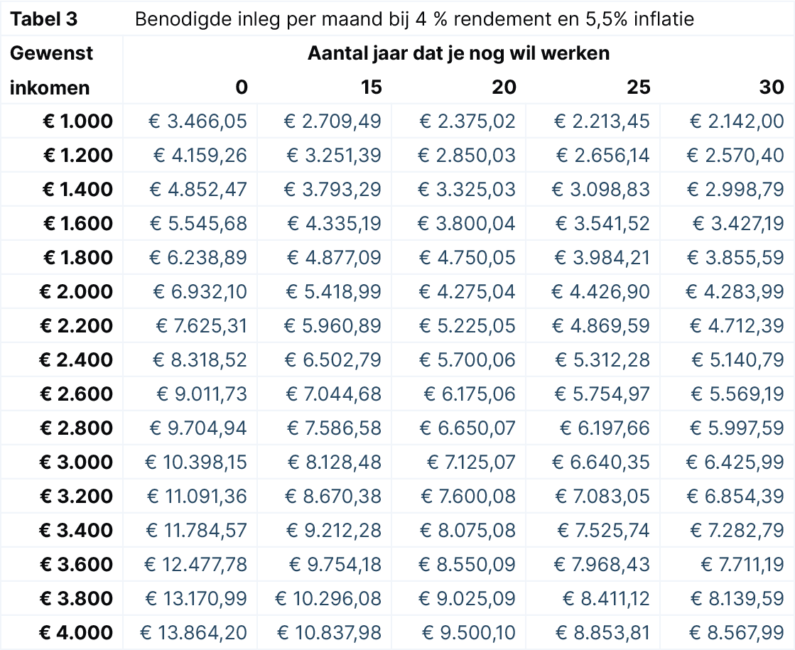 Het CPB verwacht dat de inflatie volgend jaar een stuk lager uitvalt, maar is wel voorzichtig. Over 2023 is in het gunstigste geval 2,6% mogelijk, maar als de energieprijzen hoog blijven, houdt het CPB ook rekening met 5,5%. Het rekenvoorbeeld met een modaal inkomen zou dan uitkomen op een benodigd maandbedrag van respectievelijk € 2.646,39 of € 5.312,28 om financieel onafhankelijk te worden (tabel 3 & 4). Lekker vroeg stoppen met werken lijkt ook met deze inflatiecijfers niet meer realistisch.