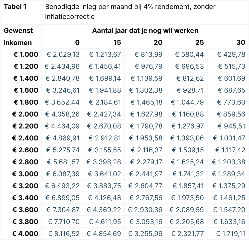 De kern van financiële onafhankelijkheid is het opbouwen van kapitaal tot je van het rendement kan leven. Aanhangers van de FIRE beweging berekenen daarom wat ze maandelijks nodig hebben om van te leven en hoeveel kapitaal daarvoor nodig is. Dat leidt uiteindelijk tot een maandelijks bedrag dat ze apart moeten houden en op een veilige manier dienen te beleggen. Hoe langer de tijd die je ervoor neemt, hoe lager het maandbedrag (zie tabel 1).