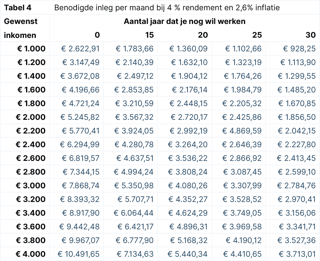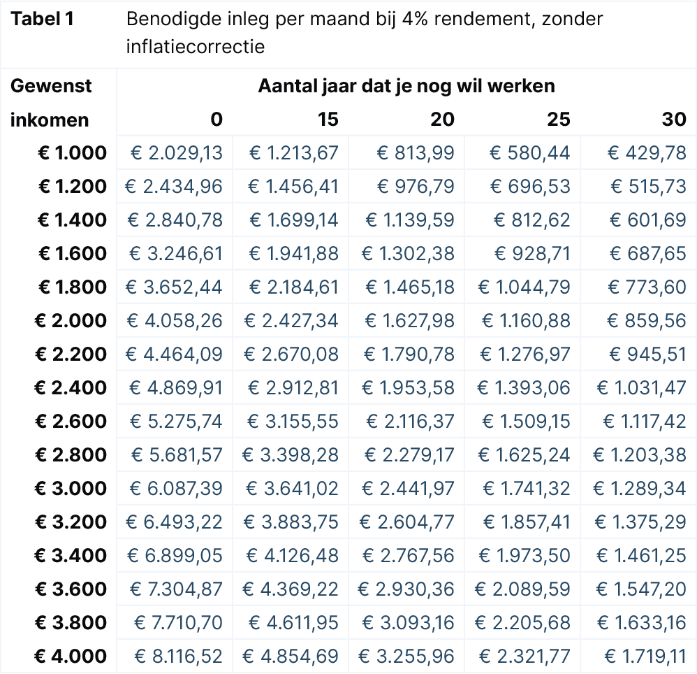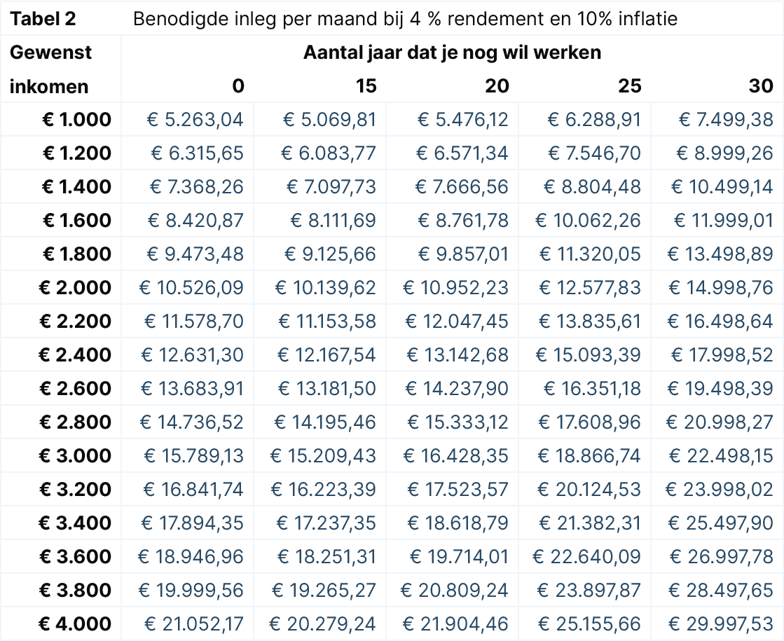 Figuur 1: De maandinleg gaat normaal gesproken omlaag als je langer de tijd neemt om tot een doelbedrag te komen. Bij torenhoge inflatie leg je uiteindelijk meer in dan je ooit per maand gaat krijgen. Dit rekenvoorbeeld gaat uit van jaarlijks 4% rendement en een uiteindelijk inkomen van €2.400 per maand.