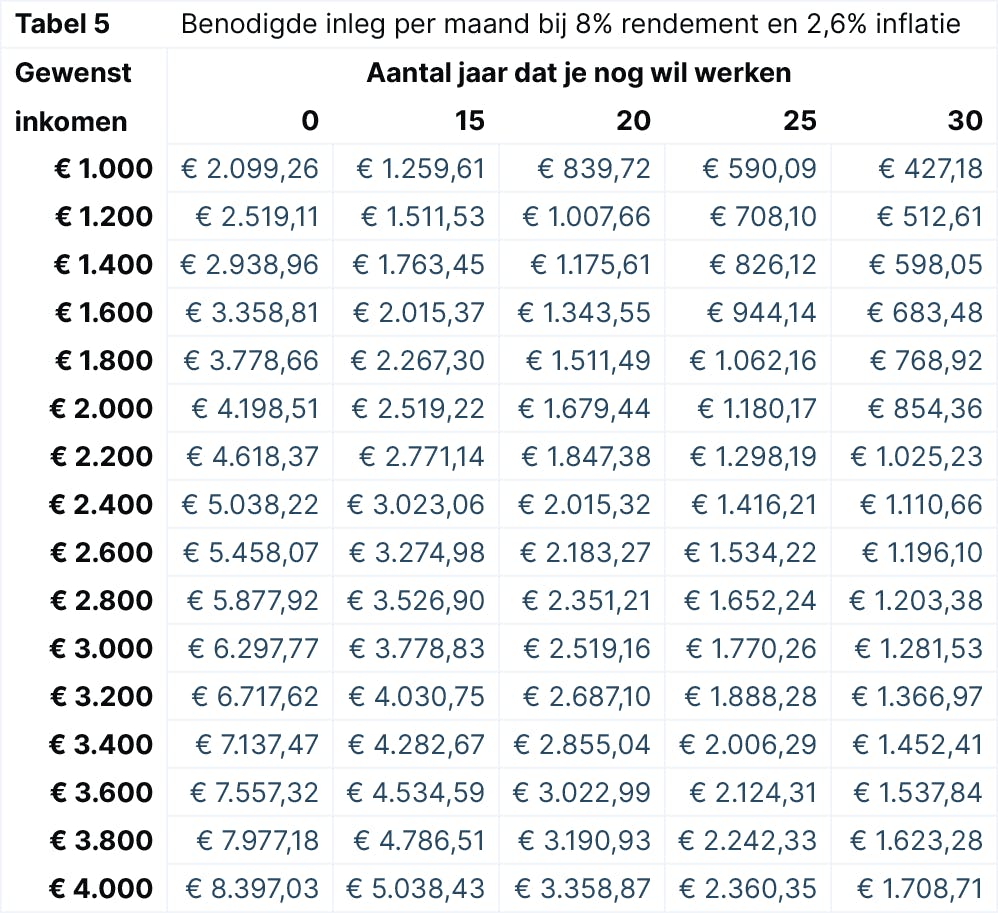 Het enige scenario dat dit doel nog binnen handbereik houdt, is een enorm rendement en een inflatiecijfer van maximaal 2 á 3 procent. Zoals tabel 5 laat zien, komt de inleg in de buurt van oude berekeningen bij een rendement van 8% of meer. Dan is een modaal vroegpensioen mogelijk voor mensen die 25 jaar lang € 1.416,21 per maand kunnen missen om te beleggen.