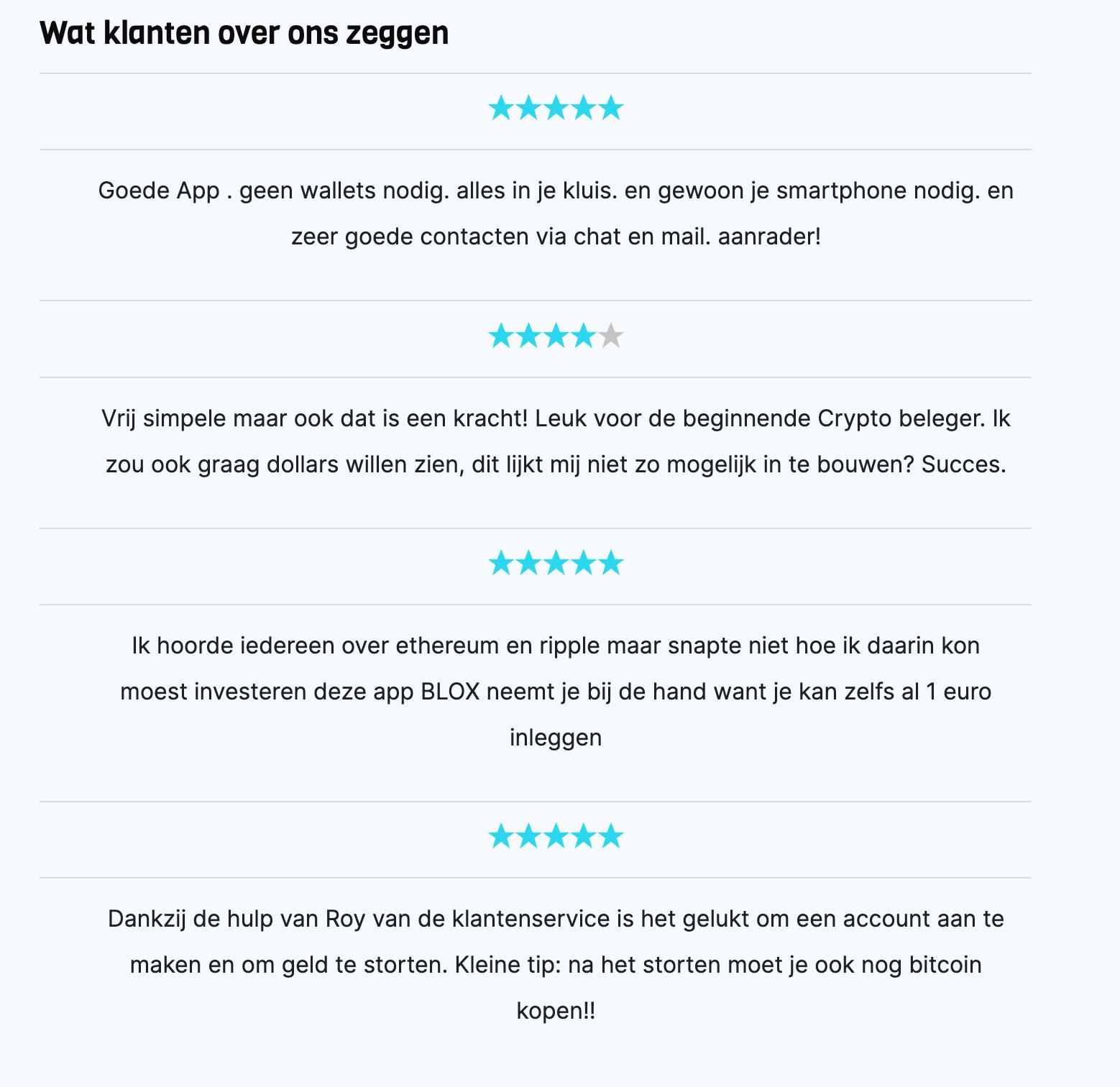 Wil jij handelen met BLOX, maar wil je toch eerst even zien wat anderen van ons vinden? Hier lees je wat gebruikers van ons vinden. Ook geven wij je zelf nog 3 redenen waarom BLOX jouw nieuwe favoriete crypto app is.