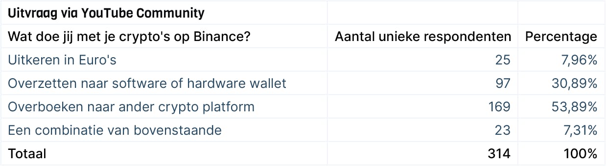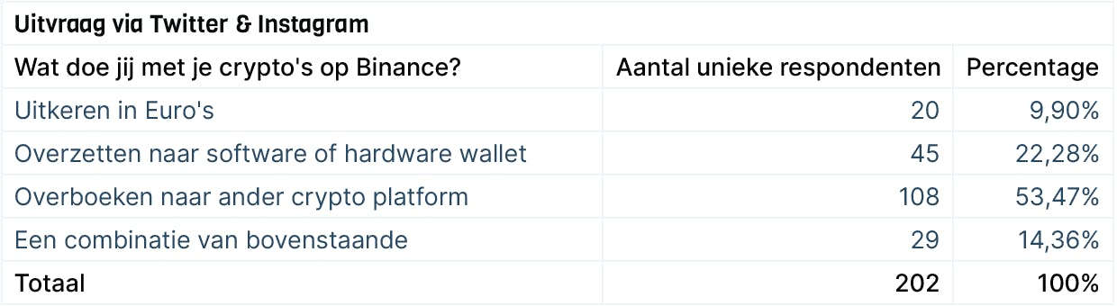 Bijna 54% geeft aan over te stappen naar een ander platform. De crypto’s worden dan vanuit de online wallet in Binance via blockchain overgeboekt naar een wallet bij het nieuwe onderkomen. Ruim 27% gaat voor een hardware wallet of software wallet in eigen beheer.