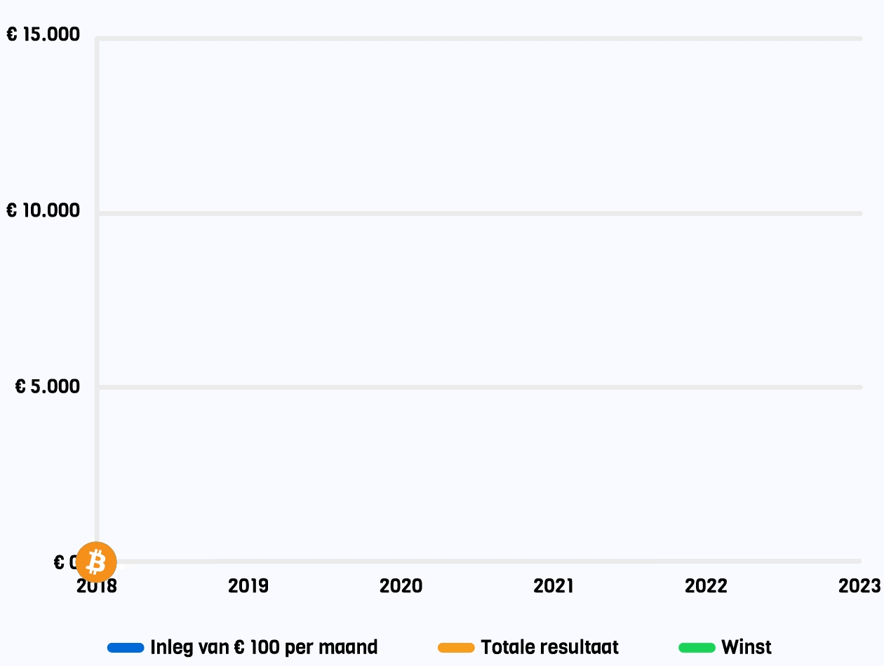 Stel: je had de afgelopen 5 jaar elke maand €100 aan Bitcoin gekocht. Dan had je nu voor zo’n €15.000 aan Bitcoin, tegenover ongeveer €6.000 aan euro’s op een bankrekening (exclusief rente).